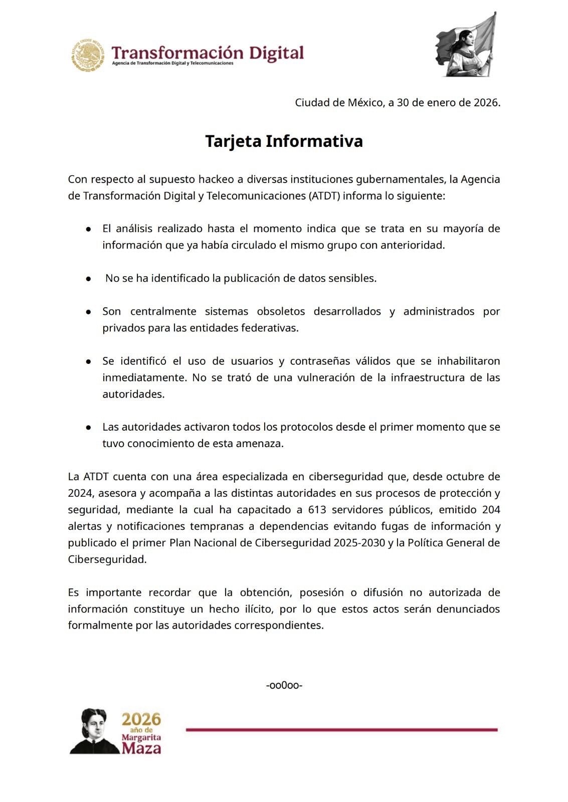 Con respecto al supuesto hackeo a diversas instituciones gubernamentales, la Agencia de Transformación Digital y Telecomunicaciones (ATDT) informa lo siguiente: