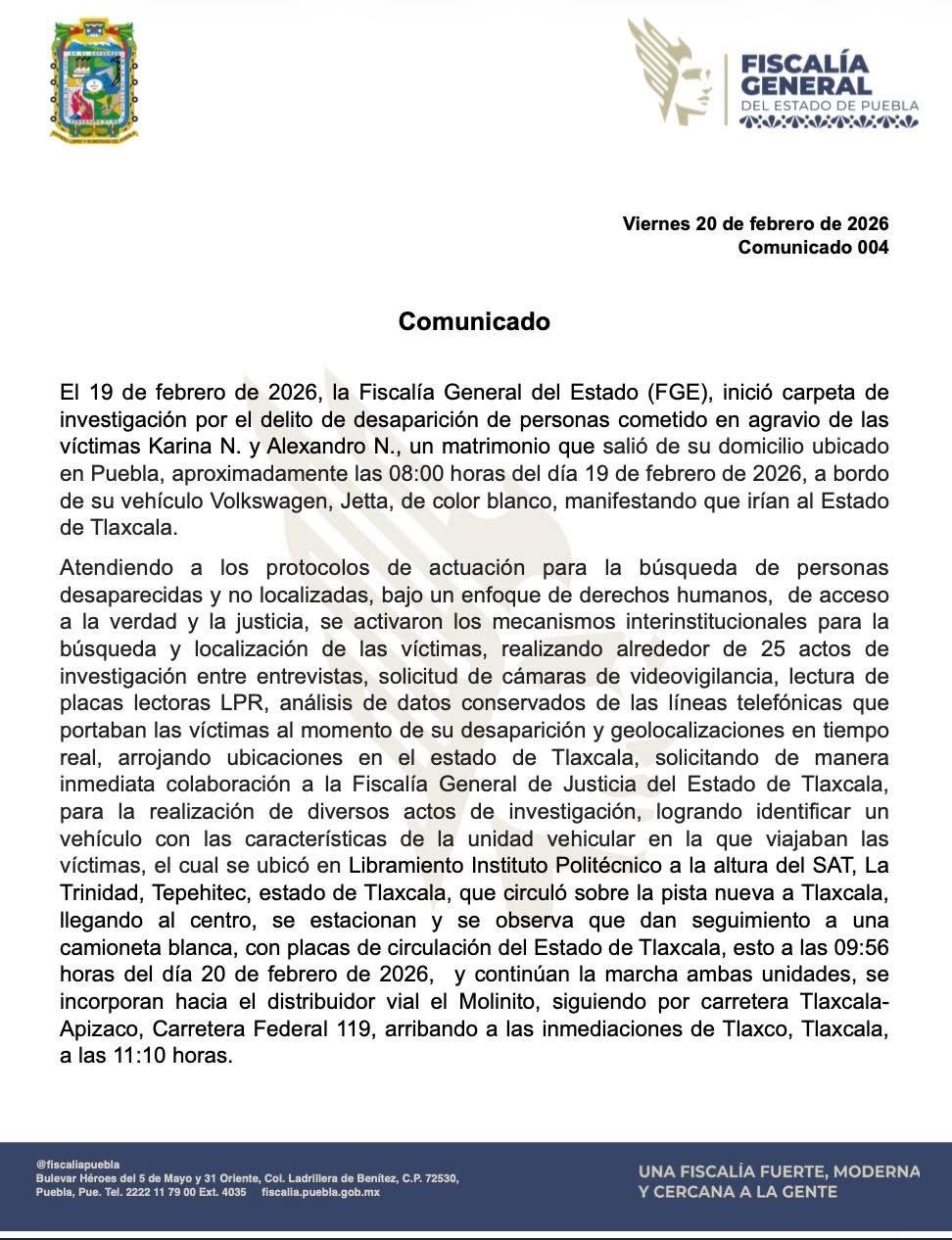 El 19 de febrero de 2026, la Fiscalía General del Estado (FGE), inició carpeta de investigación por el delito de desaparición de personas cometido en agravio de las víctimas Karina N. y Alexandro N., un matrimonio que salió de su domicilio ubicado en Puebla, aproximadamente las 08:00 horas del día 19 de febrero de 2026, a bordo de su vehículo Volkswagen, Jetta, de color blanco, manifestando que irían al Estado de Tlaxcala.