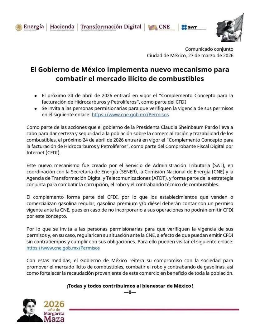 El SAT informa que, como parte de las acciones del Gobierno de México para fortalecer la comercialización y trazabilidad de combustibles, el 24 de abril de 2026 entrará en vigor el Complemento Concepto para la facturación de Hidrocarburos y Petrolíferos, integrado al Comprobante Fiscal Digital por Internet (CFDI).