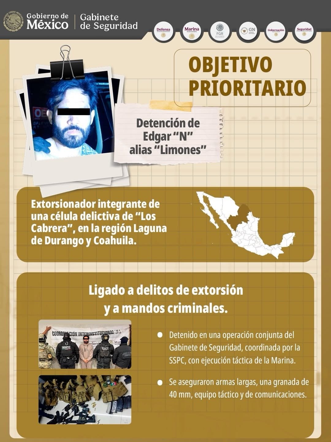 La detención de Edgar “N”, alias “Limones”, en un operativo coordinado entre Secretaría de Marina, Defensamx, Secretaría de Seguridad y Protección Ciudadana, Fiscalía General de la República y el Centro Nacional de Inteligencia, representa un golpe directo a las redes de extorsión en la región de La Laguna, en Durango y Coahuila. Este resultado, en línea con la Estrategia Nacional contra la Extorsión instruida por la Presidenta Claudia Sheinbaum Pardo, permitió asegurar armamento y equipo táctico, y desarticular actividades que afectaban a comerciantes y ganaderos. El Gabinete de Seguridad reconoce la coordinación con el Gobierno de Coahuila por su participación en esta acción.