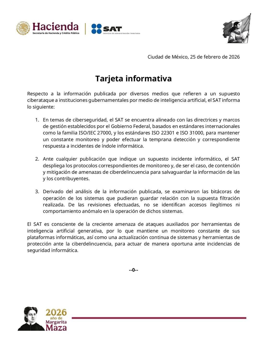 Ciudad de México, 25 de febrero de 2026 Respecto a la información publicada por diversos medios que refieren a un supuesto ciberataque a instituciones gubernamentales por medio de inteligencia artificial, el SAT informa