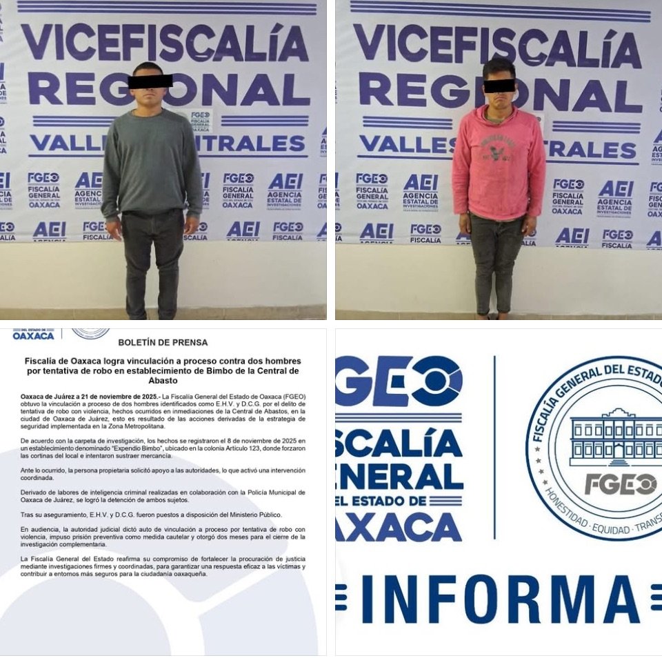 Oaxaca de Juárez a 21 de noviembre de 2025.- La Fiscalía General del Estado de Oaxaca (FGEO) obtuvo la vinculación a proceso de dos hombres identificados como E.H.V. y D.C.G. por el delito de tentativa de robo con violencia, hechos ocurridos en inmediaciones de la Central de Abastos, en la ciudad de Oaxaca de Juárez, esto es resultado de las acciones derivadas de la estrategia de seguridad implementada en la Zona Metropolitana.