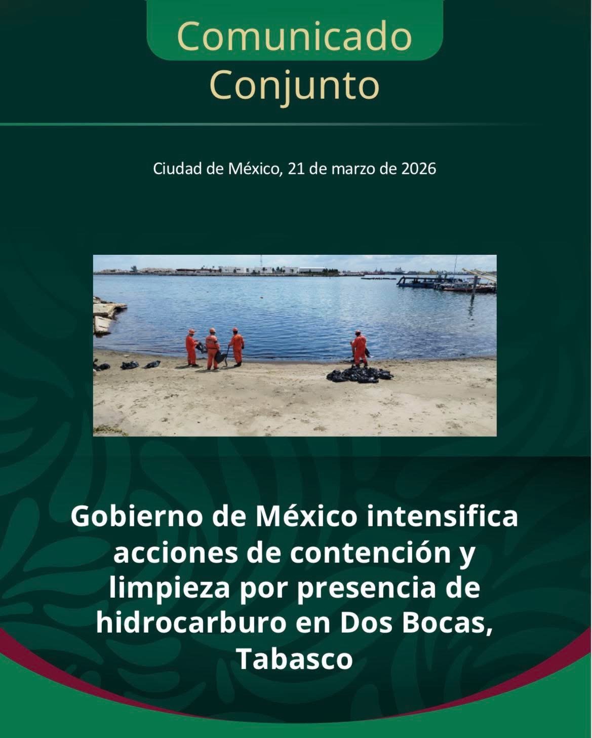 21/032026 El Gobierno de México mantiene un operativo de atención interinstitucional ante la presencia de hidrocarburos detectada en inmediaciones de Dos Bocas, Tabasco, con la participación de la Secretaría de Marina (Semar), la Secretaría de Medio Ambiente y Recursos Naturales (Semarnat), Petróleos Mexicanos (Pemex), la Procuraduría Federal de Protección al Ambiente (Profepa) y la Secretaría del Medio Ambiente y Desarrollo Sostenible de Tabasco (Semades).