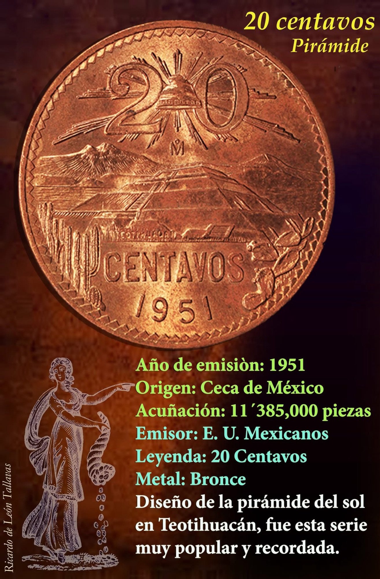 La moneda del día: Esta moneda hizo su aparición en 1943 reemplazando a las de plata, era insostenible seguir gastando ese metal en ese momento, por lo que el cobre hizo su presencia luego de 45 años de estarse usando monedas con el valor de 20 centavos. Este diseño fue producto del talento de Manuel Luna Negrete y Francisco Rivera Paniagua, siendo el inicio de la serie más duradera de temática mexicana en las monedas post-revolucionarias, por llevar dos representaciones puramente indígenas en sus dos caras principales y haber durado 31 años acuñándose.