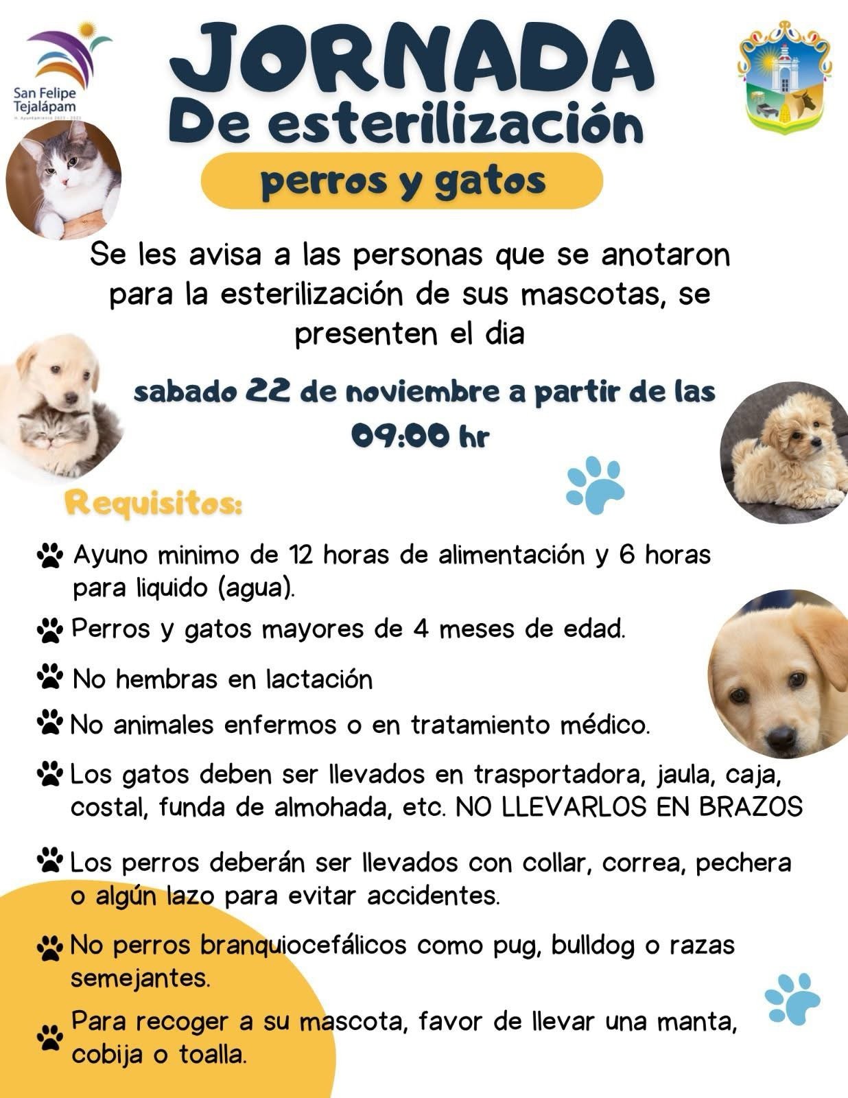 El H. Ayuntamiento a través de la regiduría de Higiene y Salud, comunican a las personas que anotaron a sus mascotitas a la campaña de esterilización, la fecha y hora de esta actividad.
