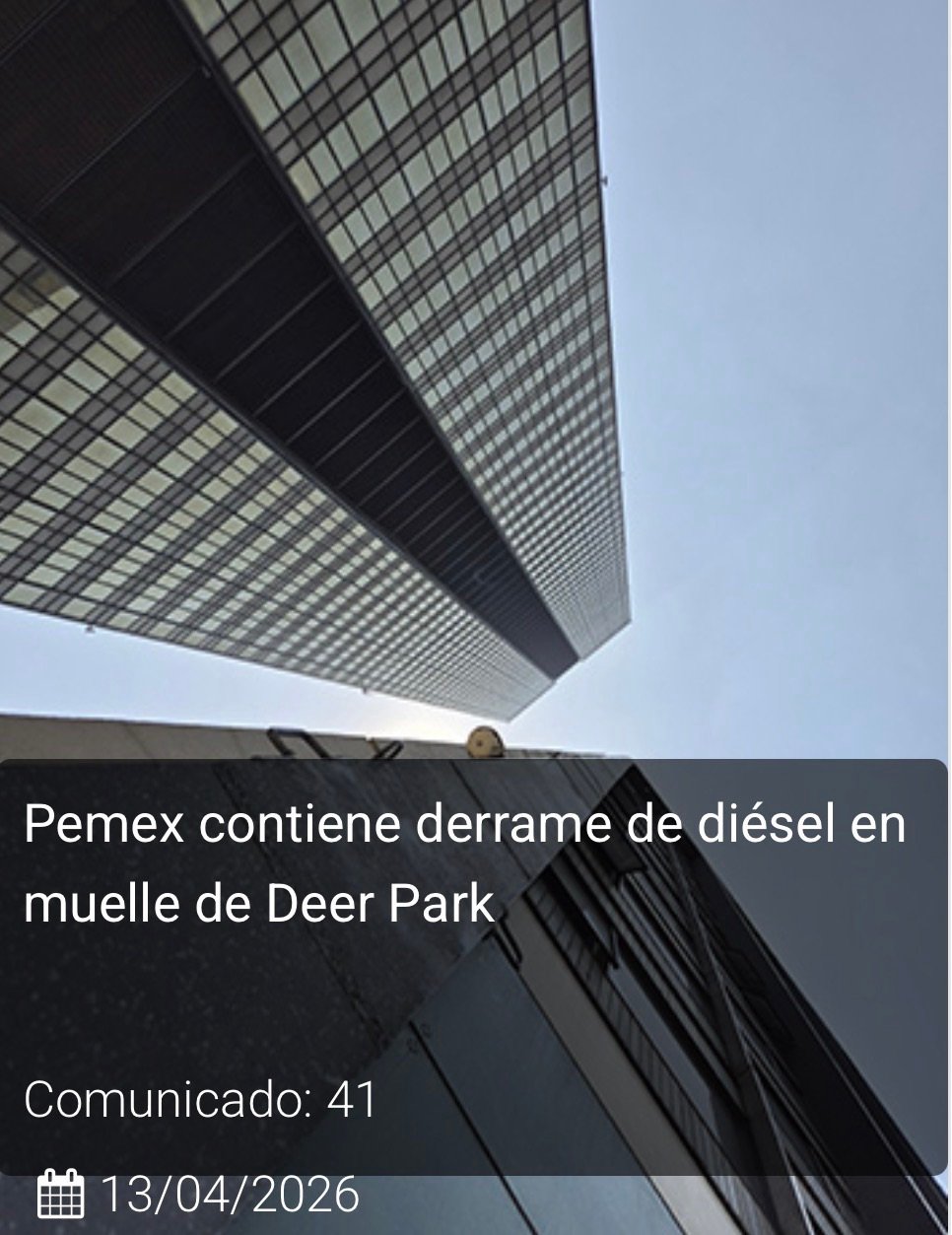 Petróleos Mexicanos (Pemex) informa que personal especializado de Deer Park contuvo un derrame de diésel registrado en el muelle de la refinería, ocasionado por la interacción de dos barcos privados, uno que era abastecido con diésel y el otro que acaba de completar su carga y se dirigía a la salida del canal.