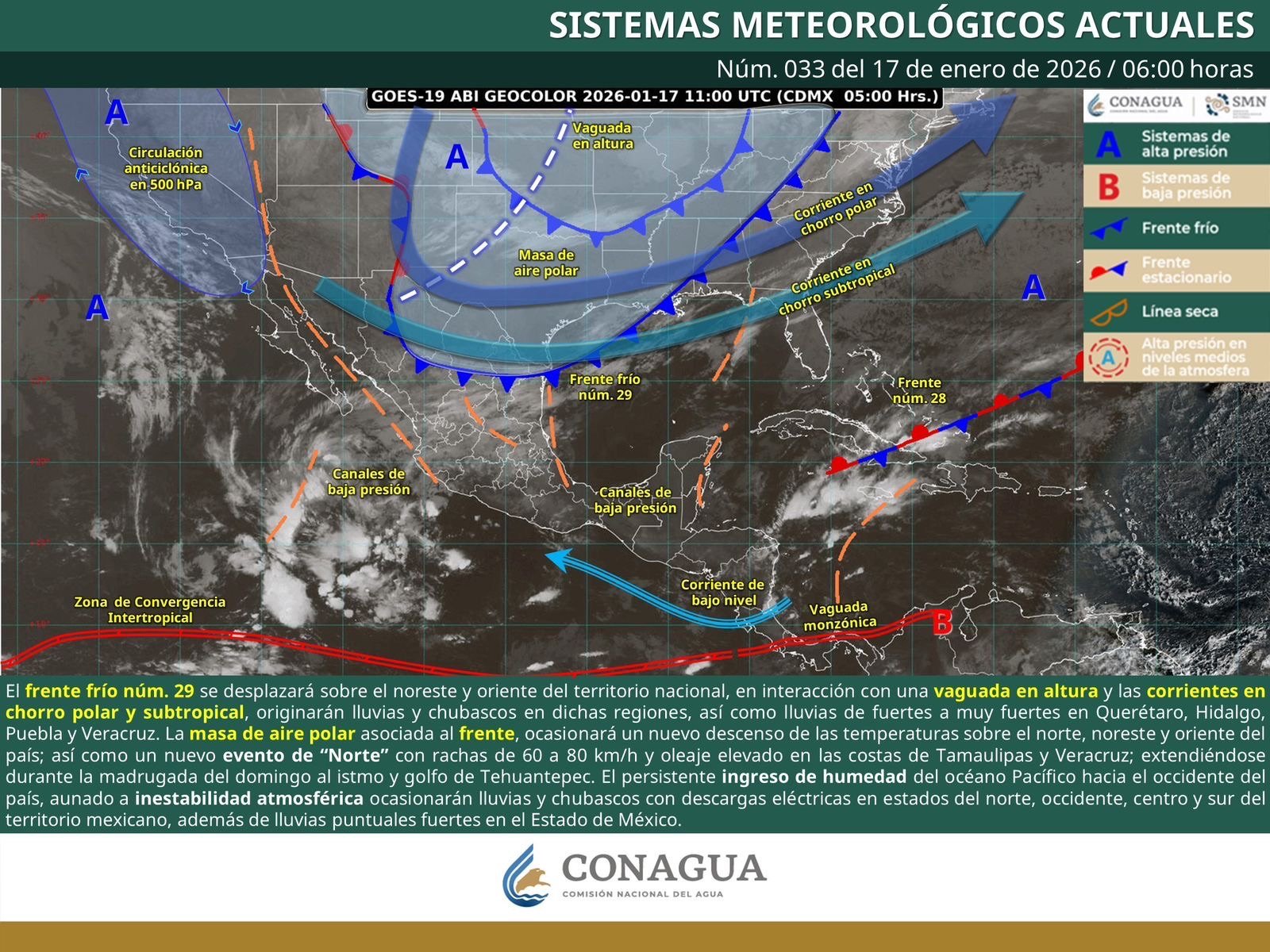 De acuerdo con el pronóstico del tiempo emitido por la Comisión Nacional del Agua (Conagua), estas condiciones son derivadas del tránsito del frente frío número 29 sobre el noreste y oriente del territorio nacional durante este sábado.
