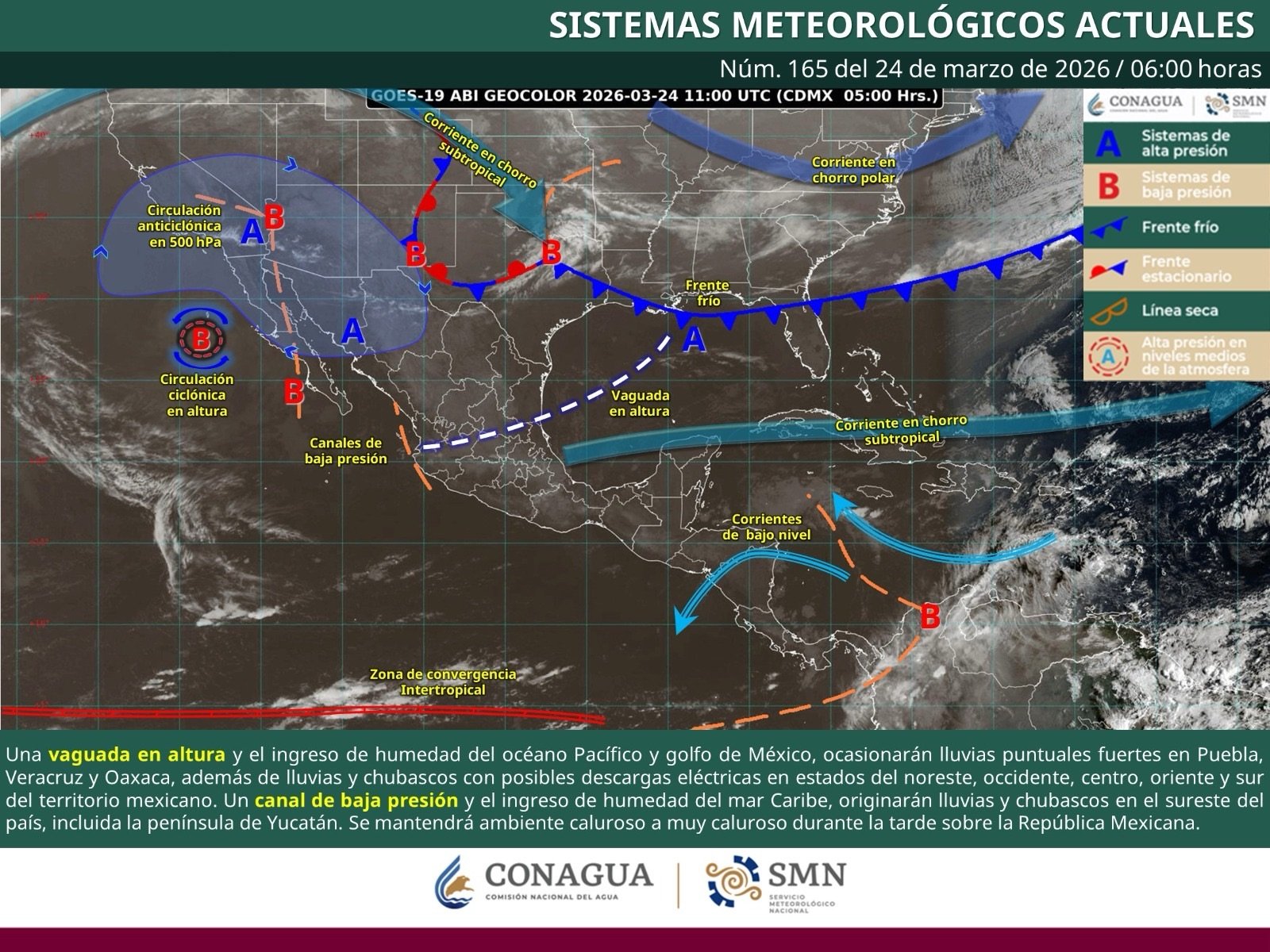 Estas condiciones son ocasionadas por una vaguada localizada en niveles altos sobre el interior de la República, en combinación con el ingreso de humedad proveniente del océano Pacífico y Golfo de México.