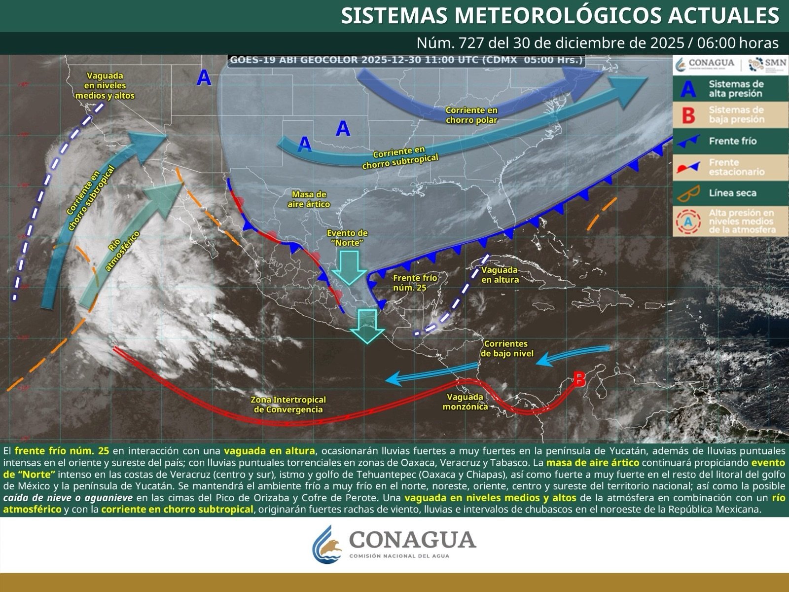 Estas condiciones son ocasionadas por el frente frío número 25, que se extiende sobre la península de Yucatán, en combinación con una masa de aire frío de origen ártico que lo impulsa; ambos sistemas están asociados con una vaguada en niveles altos de la atmósfera.
