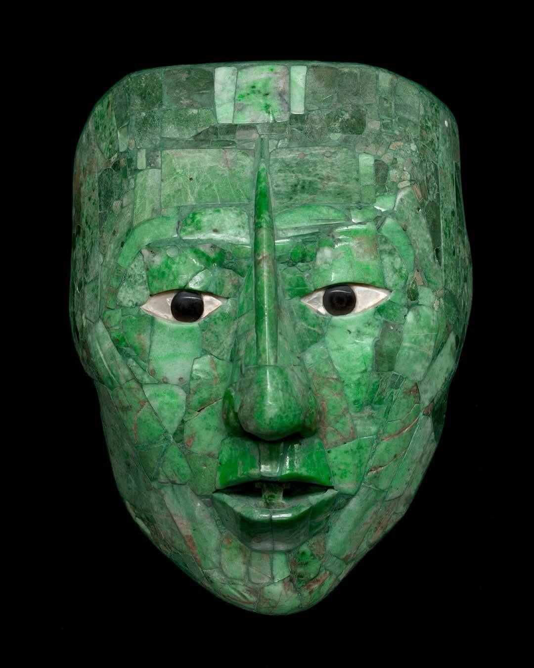 La máscara está integrada por cerca de 340 teselas de jadeíta de 6 tonalidades distintas de verde, mientras que los ojos son aplicaciones de concha y obsidiana.