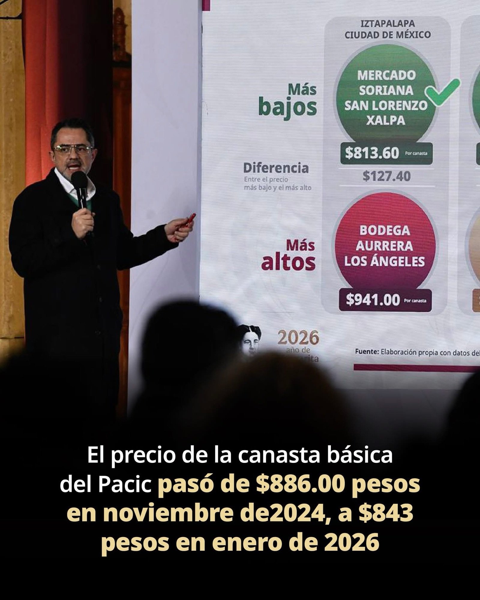Explicó que en noviembre de 2024, cuando la mandataria firmó el acuerdo de renovación del Pacic, el precio de la canasta estaba en $886 pesos, y pasó a $843 pesos en enero de 2026, “cumpliendo así con el acuerdo voluntario entre el Gobierno Federal y el sector empresarial. Un reconocimiento a las agroindustrias y a las tiendas de autoservicio que están cumpliendo con este compromiso”, expresó el servidor público.