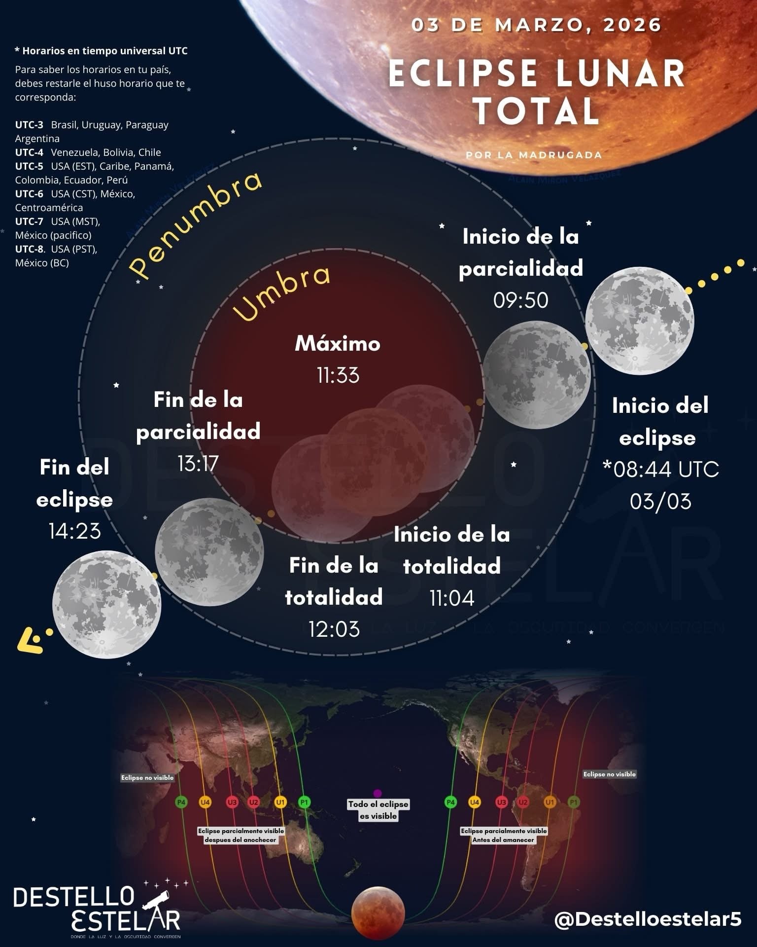 Dentro de un mes, exactamente en la madrugada del 3 de marzo, seremos testigos del primer eclipse lunar del año, se tratará de un eclipse lunar total que podrá verse desde todo el continente americano poco antes del amanecer, para conocer los horarios exactos es necesario saber el huso horario que se maneja en tu país y restar esas horas a los horarios de la infografía.
